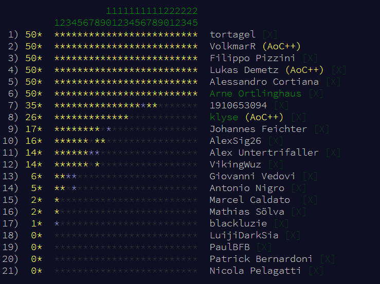 È tempo di condividere i risultati dell’Advent of Code challenge, che ha visto la partecipazione di 15 collaboratori ACS & INFOMINDS. Gli enigmi erano come sempre impegnativi, ma non hanno scoraggiato nemmeno chi di professione non fa il developer. Infatti, sia Filippo Pizzini (Helpdesk System Enginner a Trento) che Alessandro Cortiana (System Engineer a Verona) hanno partecipato ottenendo ottimi risultati. Filippo ha ottenuto il secondo posto mentre Alessandro è arrivato terzo. Michael Reisigl è salito sul gradino più alto del podio. Arne Ortlinghaus si è classificato quarto. Da notare anche che alcuni special guests della Challenge di quest’anno sono studenti di informatica che hanno iniziato a sviluppare proprio grazie all’Advent of Code, raggiungendo ottimi risultati. Alcuni colleghi non hanno avuto abbastanza tempo per risolvere tutti gli enigmi ma li ringraziamo comunque per l’impegno e la partecipazione. Nelle foto vedete i premi messi a disposizione da Volkmar. Ma non è finita qui… Presto ci sarà l’estrazione per un buono Amazon del valore di 50 euro per chi ha raggiunto il numero minimo di 5 stelline! Scopriremo il vincitore nel prossimo Stay Updated 😊 Il fortunato vincitore sarà tra questi: 50* Michael Reisigl 50* Volkmar Rigo 50* Filippo Pizzini 50* Alessandro Cortiana 50* Arne Ortlinghaus 17* Johannes Feichter 16* Alex Sigmund 14* Alex Untertrifaller 14* Kevin Wild 6* Giovanni Vedovi 5* Antonio Nigro